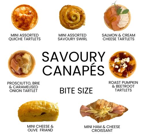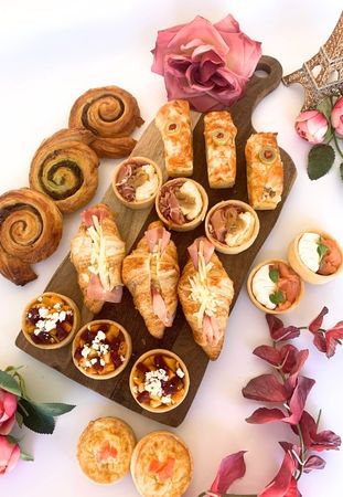 Savoury made easy! Our French-style canapé catering includes bite-sized favourites like mini croissants, quiches, friands, and salmon & cream cheese tarts – perfect for sharing at your next gathering.